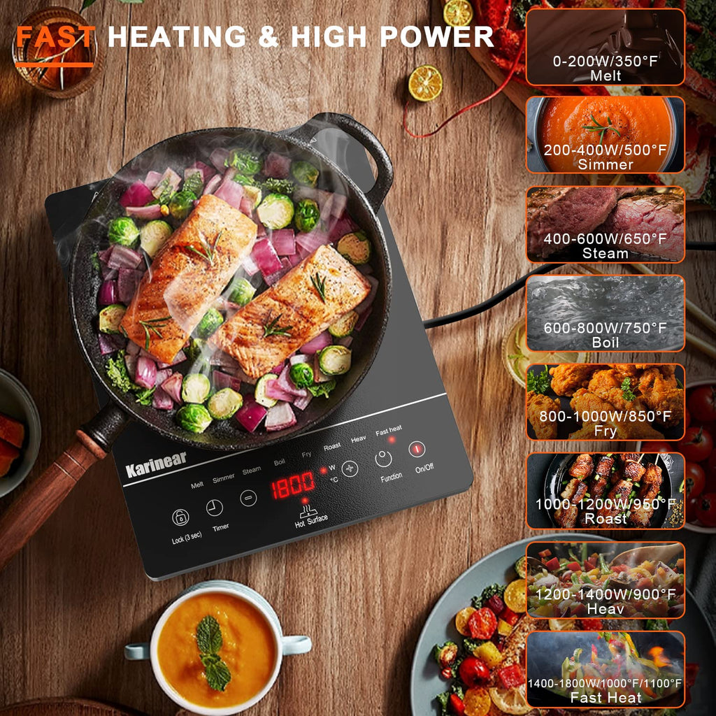 - 【1800W Fast Heating Electric Hot Plate】The portable cooktop has 9 power levels (200W-1800W) and 9 temperatures (250 ° F~1100 ° F) to be adjusted. You can use the portable burners for cooking easily, such as meat, summer, steam, boil, dry, fast, heavy, fast heat. The maximum power of this single electric burner is 1800W, and the heating speed is very fast. The heating effect of the ceramic cooktop is the same as that of gas stoves, and the food made is as delicious as gas stoves.