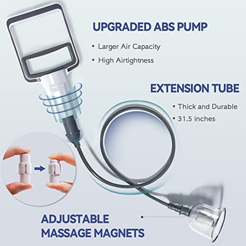 - Longer Extension Tube & Adjustable Magnets: The extension tube measures 31.5", longer than others on the market, which is more convenient for cupping by yourself. 12 upgraded elastic magnets can automatically adjust its height without stinging or hurting the skin. The set also comes with Gua Sha scraping tool.