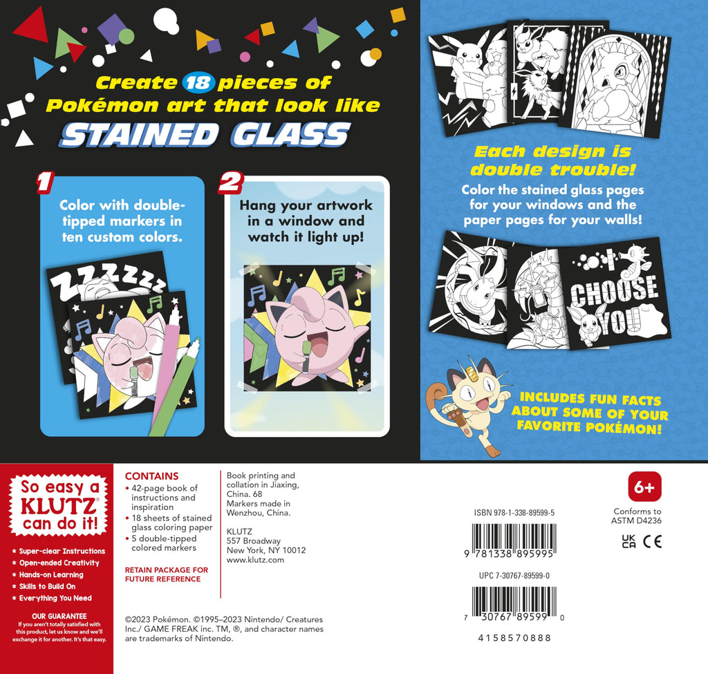 Details: Special vellum paper lets you color in 18 pieces of Pokémon art that look like stained glass. Use the included double-tipped markers in 10 custom colors. Then hang your artwork in a window and watch it light up! Each design is double trouble. Color the stained glass vellum pages for your windows, and the paper pages for your walls. Artwork features Pikachu, Eevee, Charizard, and many more. Plus, learn fun facts about some of your favorite Pokémon!