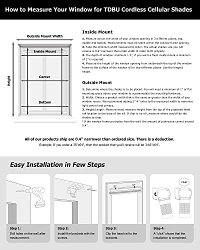 - A standard 2/5 inch deduction is made to the fabric width for a proper INSIDE MOUNT fit. The true blind size is 29 3/5" x 64" H. OUTSIDE MOUNT: Blinds width is recommended to be 1-4 inches wider than actual window width for better light blocking.