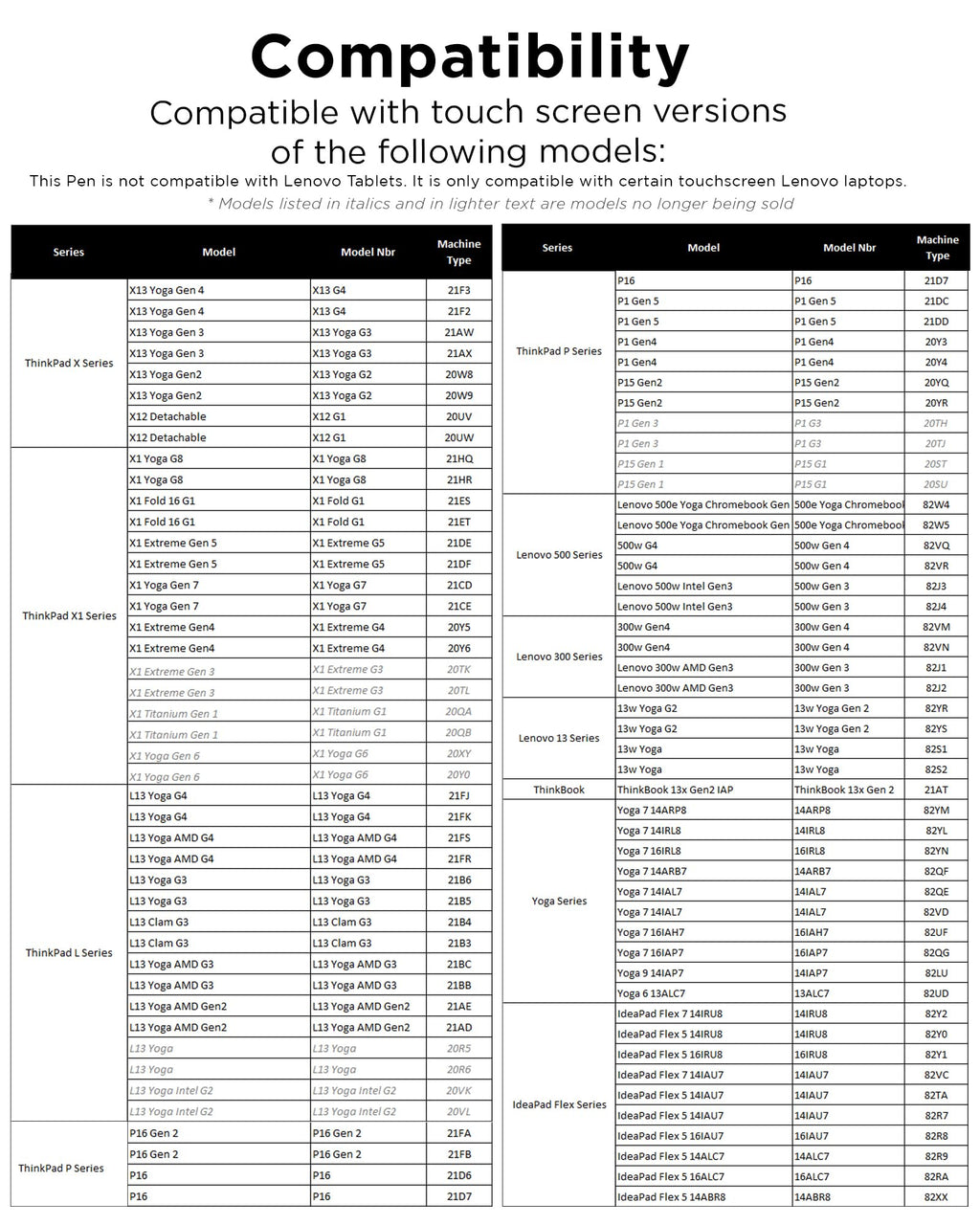 - Works with Touch Screen versions of the following models: IdeaPad Flex 5 14ALC7-82R9, IdeaPad Flex 5 14IAU7-82R7 , IdeaPad Flex 5, IdeaPad Flex 5 16ALC7-82RA, IdeaPad Flex 5 16IAU7-82R8, Yoga 6 13ALC7-82UD, Yoga 7 14ARB7-82QF, Yoga 7 14IAL7-82QE, Yoga 7 14IAL7-82VD, Yoga 7 16IAH7-82UF, Yoga 7 16IAP7-82QG, Yoga 9 14IAP7-82LU, ThinkBook 13x G2 IAP-21AT
