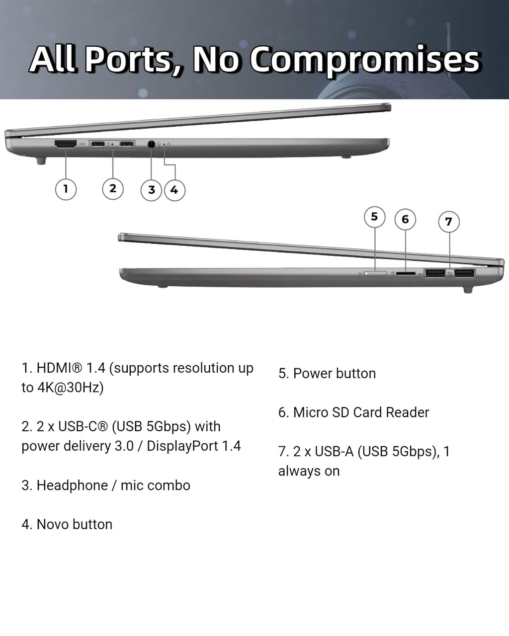 🪙 Built in Cosmic Blue aluminum and tested to MIL-STD-810H, this lenovo laptop balances durability and style for travel and hybrid work. 📡 Connectivity includes dual USB-C with DP 1.4 and PD 3.0, dual USB-A, HDMI 1.4b, microSD, Wi-Fi 6, and Bluetooth 5.2. With Windows 11 Pro pre-installed and an Accessory Kit included, the ideapad supports up to 64GB RAM and up to 4TB SSD so your setup scales with your ambitions