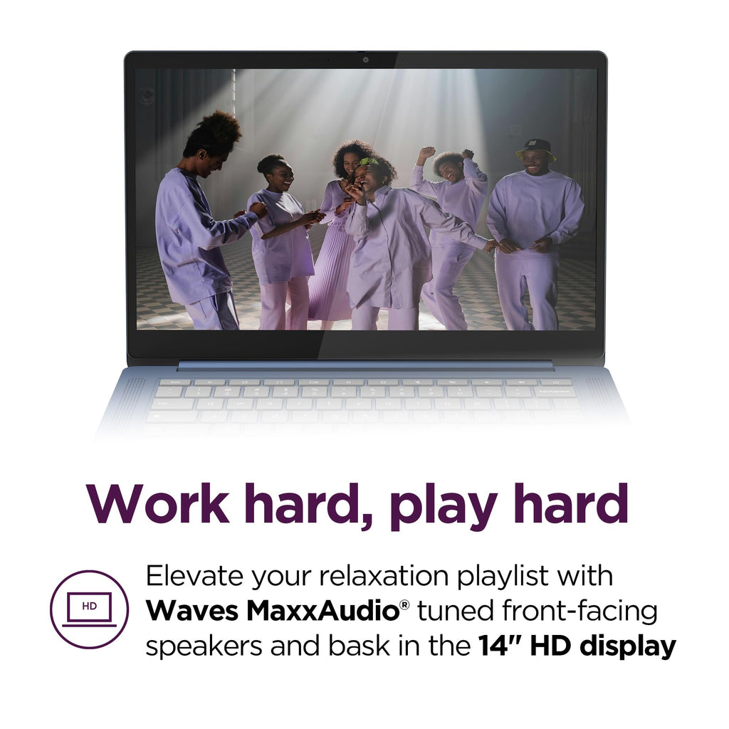 • WORK HARD, PLAY HARD - Elevate your playlist with Waves MaxxAudio-tuned stereo speakers and bask in the 14” HD display.
