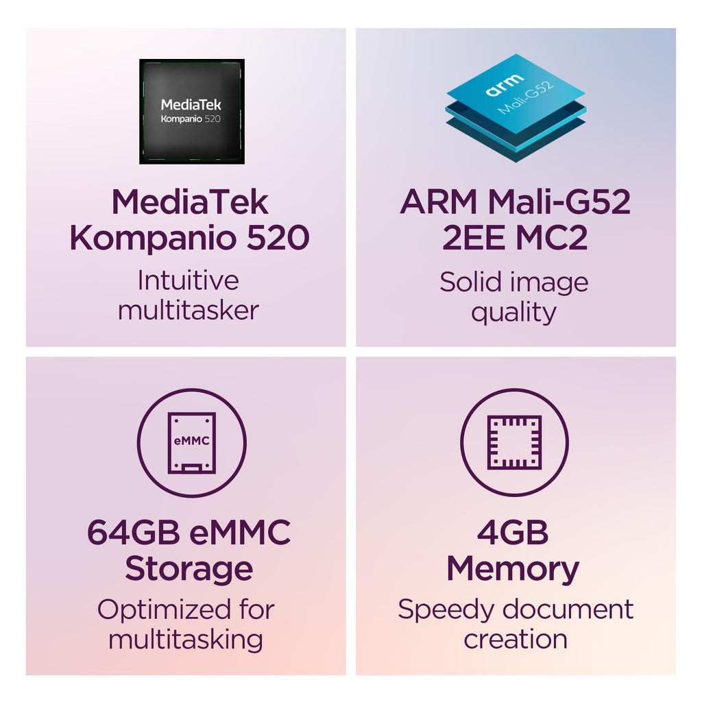• YOUR ULTIMATE COMPANION - Ensure your work and study sessions flow naturally with the efficient MediaTek Kompanio 520 Processor, packed in a quiet chassis.