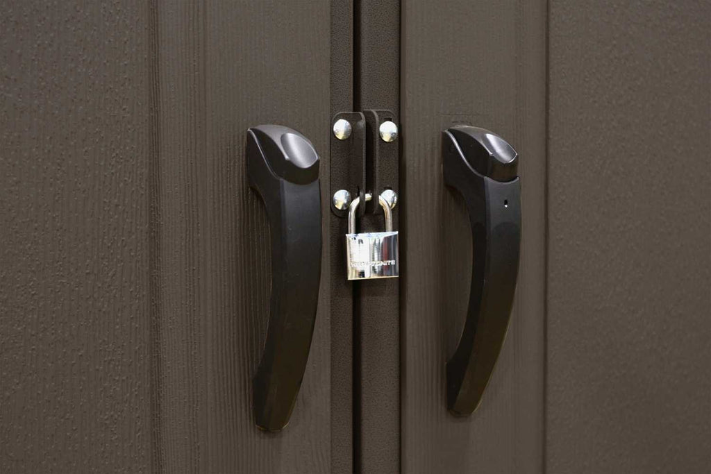 - Arched, steel-reinforced doors offer a 4' wide x 6' high door opening, lockable doors with internal latching mechanism