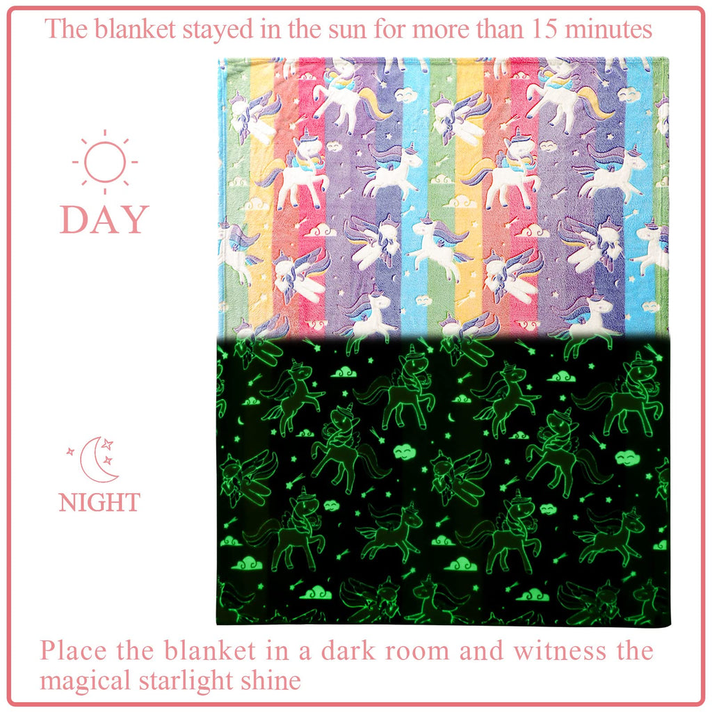- Soft Rainbow Luminous Unicorn Blanket: 3 4 5 6 7 8 9 10 year old girl gifts ideas. The unique design of the cool stuff rainbow unicorn baby blankets for girls is that it can glow in the dark, mysterious and interesting. Simply expose the unicorn blanket to bright light or sunlight for 15-30 minutes and see the magic in the dark