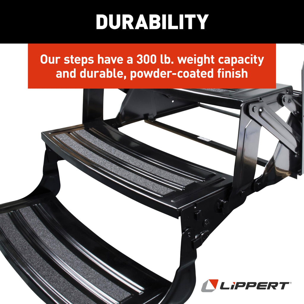 Details: Easy to extend and store the Lippert™ Radius Manual Steps are a durable, safe solution when it comes to upgrading or replacing the steps on your RV. Each step is 24" wide and equipped with anti-slip grip tape for enhanced safety and traction. The compact design also makes it ultra-simple to expand and collapse your steps with just one hand. Plus, our steps are constructed with a black, powder-coated finish so they can withstand all the wear and tear of the great outdoors.The Lippert Radius Manual steps are available in single, double and triple configurations. Each steps is 24" wide and comes with anti-slip grip tape for safety. Our steps have a 300 lb. weight capacity and durable powder-coated finish that can take on outdoor elements.These steps attach to the underside of your RV's chassis, directly beneath your entry door. To choose which size you'll need, measure the width and depth of the space under your RV that lines up with your door frame. To measure how many steps you need, you'll need to know your RV's entry height -- the space between the mounting point and the ground.Whether you’re on the road or on the water, Lippert supplies a broad array of premium RV, towing, and marine products designed to enhance all of your recreational pursuits. Our team is committed to always thinking about your next journey — pushing the possibilities of our products and services, all to better your time spent outdoors, whenever, wherever, for years to come.
