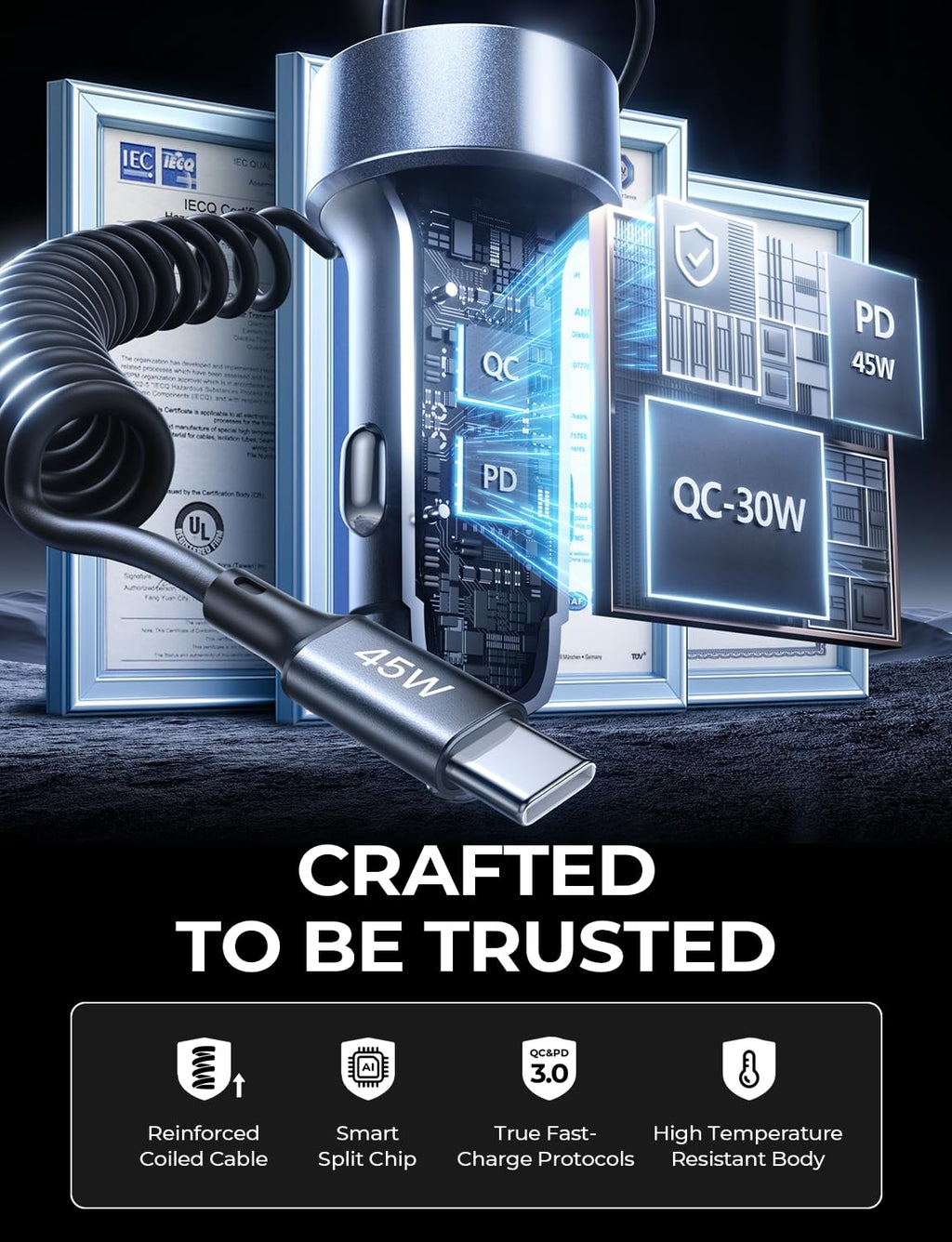 - 45W Super Fast Built-in USB-C Coiled Cable: The coiled design ensures no tangled cords and eliminates the need for multiple cables. It extends to the desired length, maintaining a clean, tidy dashboard without clutter. Plus, the low-profile plug stores neatly inside the console so the lid closes flush—unlike many retractable cable heads that are too bulky and jam the lid.