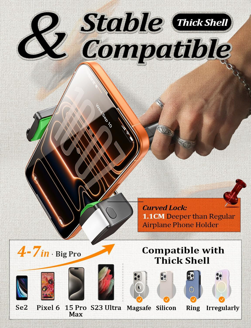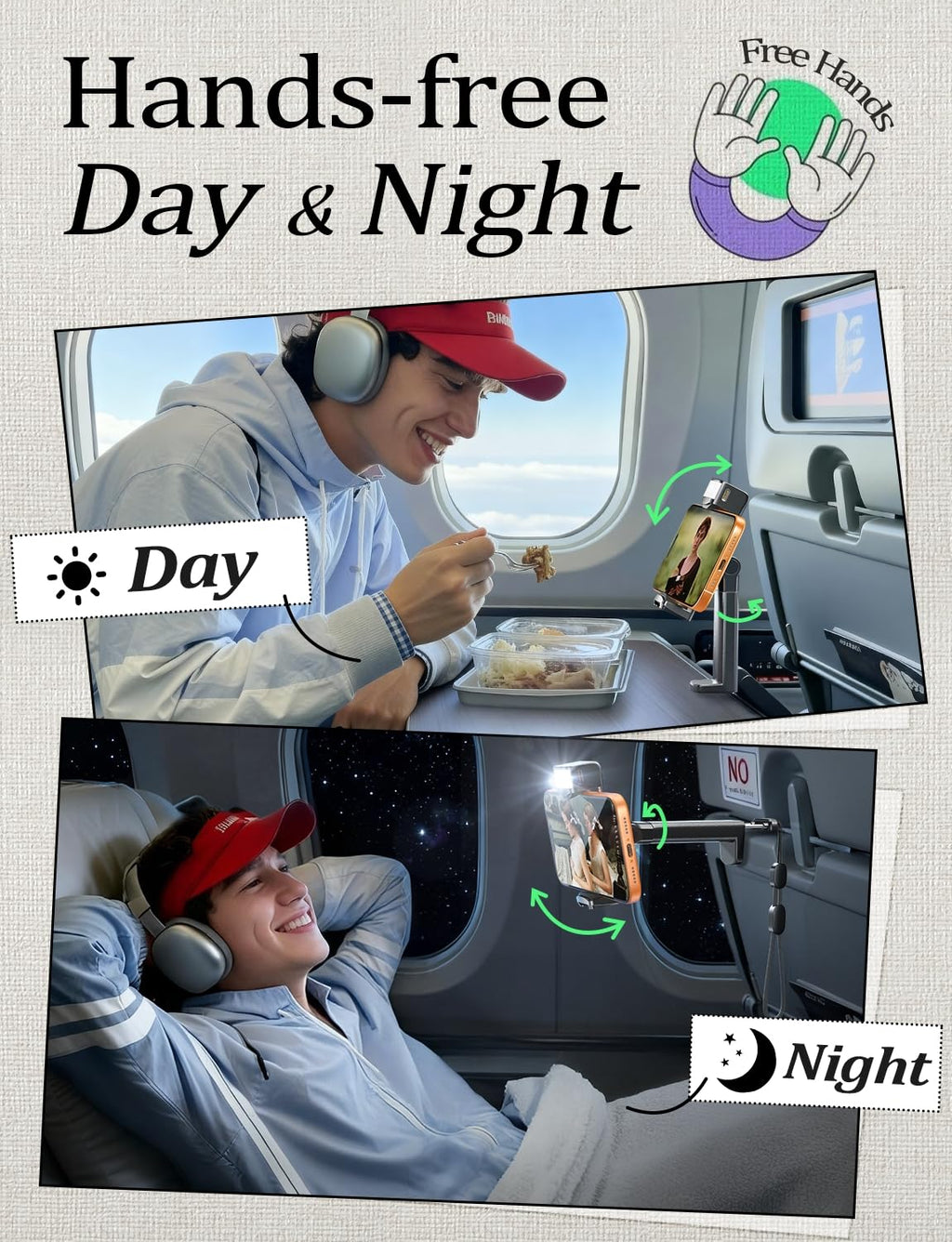 - LISEN 2025 Upgraded Airplane Phone Holder: Reliable by day, with a built-in light for night. Whether you're reclining on a plane watching a movie or cozied up in bed streaming videos, it provides the perfect viewing angle and clear visibility in low light. The ultimate practical airplane gadgets.