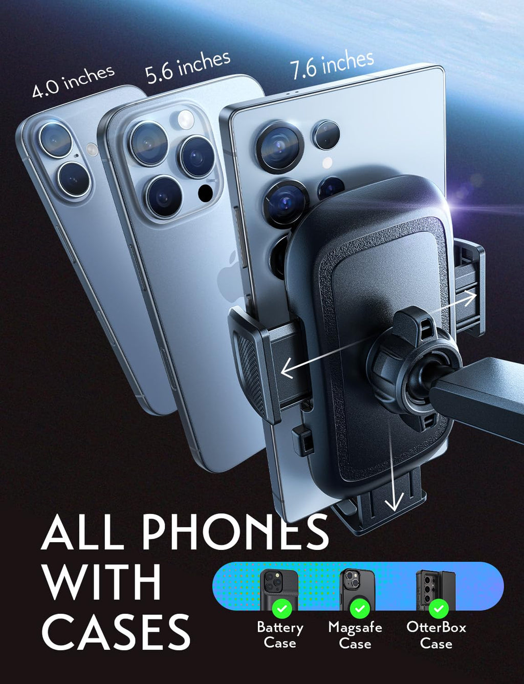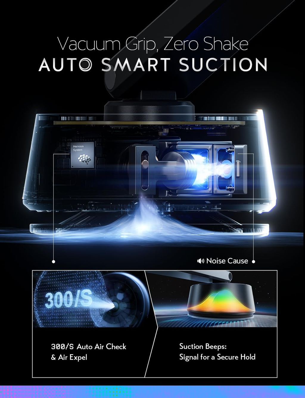 - Epic Upgrade: Brand New Suction for Unwavering Stability: Industry-leading smart car phone holder with 300+ detections/second (auto-monitors adsorption strength to prevent loosening without manual adjustments). Critical note: Vacuum activates on contact, but requires a smooth, flat surface (curved/wooden/uneven surfaces trigger continuous pumping, causing noise and battery drain).