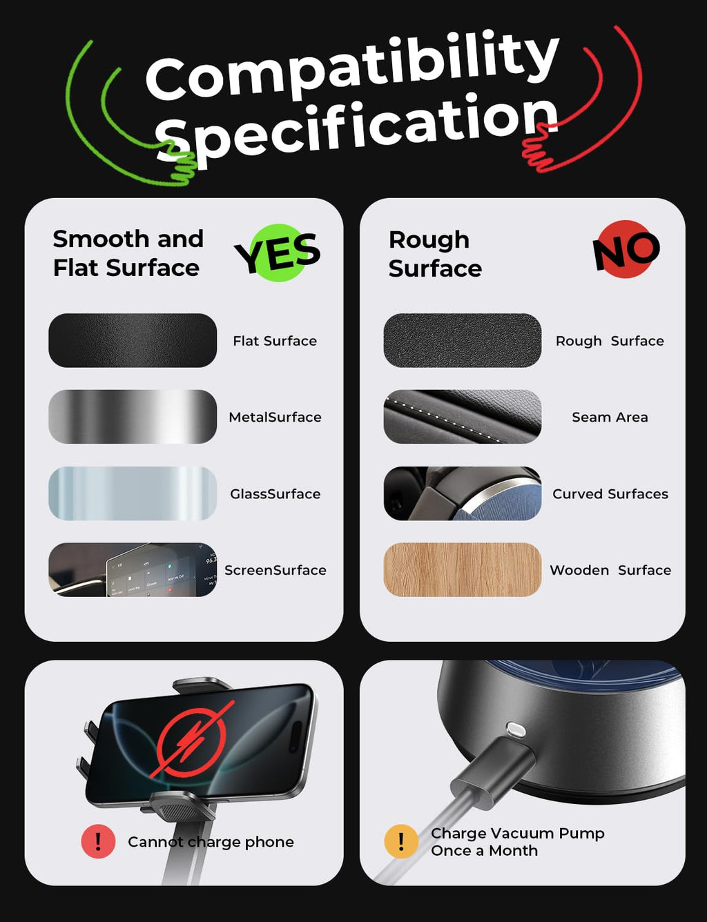 - 🚩🚩🚩 Important Installation Information: This car mount is engineered for smooth, flat surfaces (e.g., windshields, screens) to ensure a secure vacuum seal.