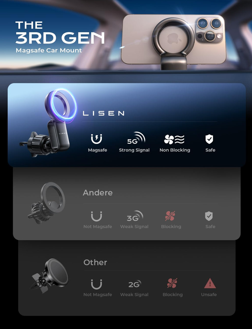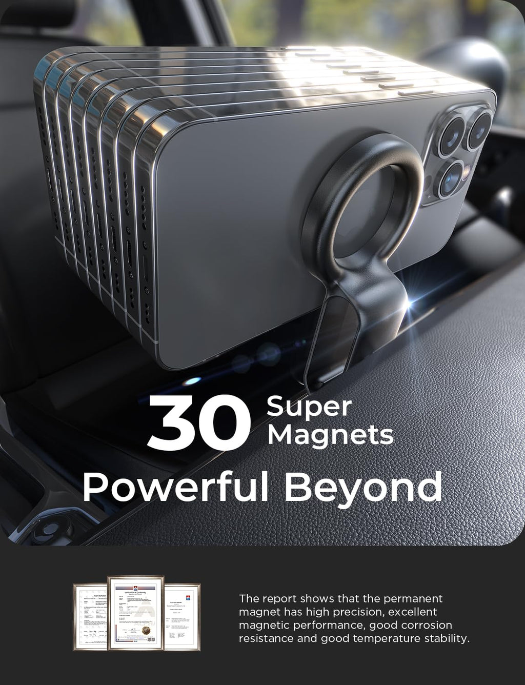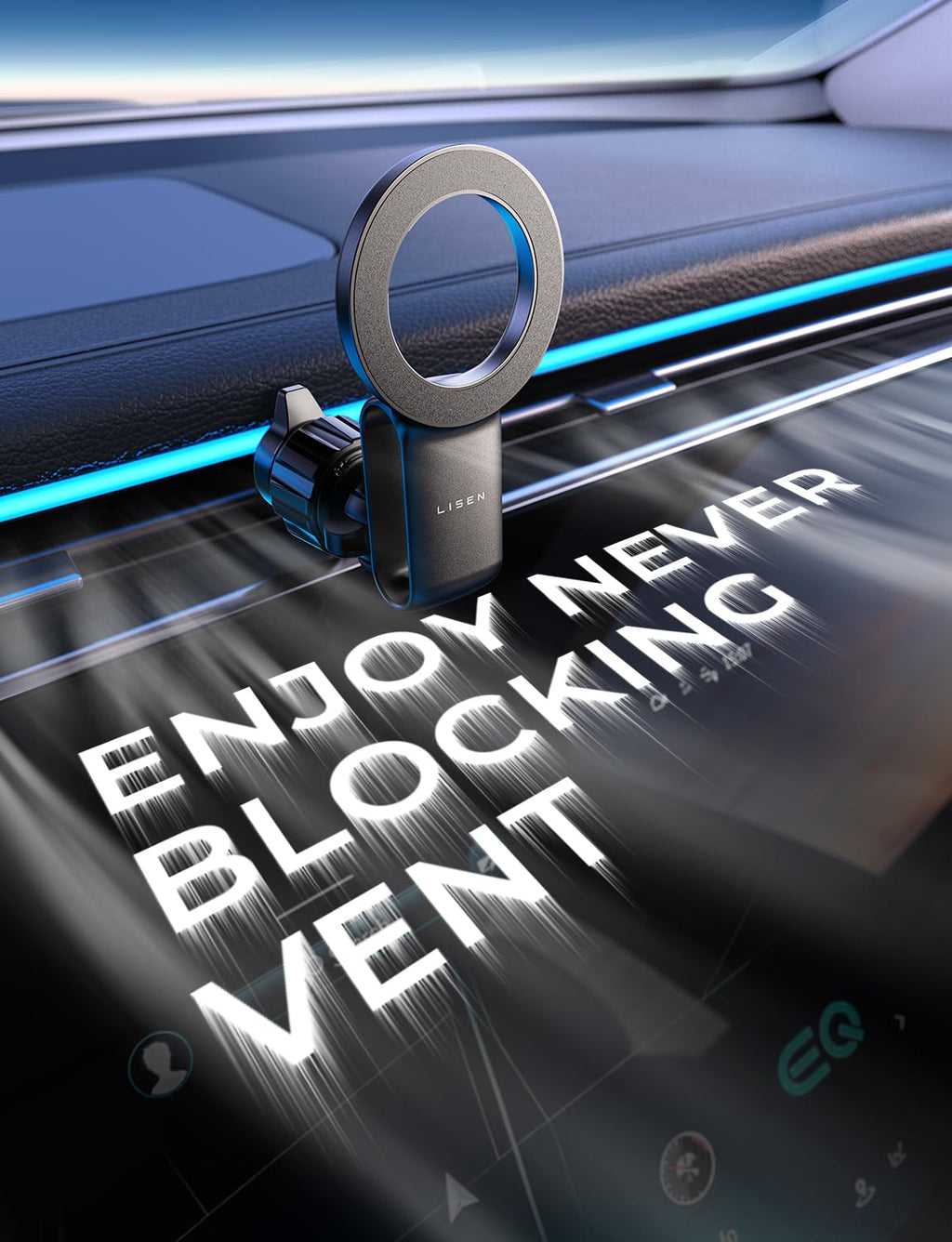 - 【30 Upgraded Magnets】2024 Upgraded Magnet Layout - 60.8% Power Boost! LISEN magnetic phone holder for car vent features 30 upgraded N55 super magnets built-in, capable of securely holding items weighing up to 6.4 lbs. The exceptionally powerful magnets ensure a firm grip on your cell phones, making it worry-free even during strong braking, sharp turns, or rough road conditions.