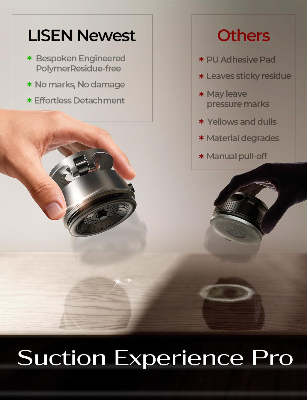 - 【Drive like a pro. Mount like a pro】 Powered by intelligent electric suction, LISEN Suction pro phone holder automatically seals with precision and monitors pressure in real time—reinforcing grip whenever needed. The moment it comes into contact with an object's surface, the suction phone mount automatically begins to adsorb, it safeguards your device with smart, adaptive strength. Pro-level stability, effortless confidence.