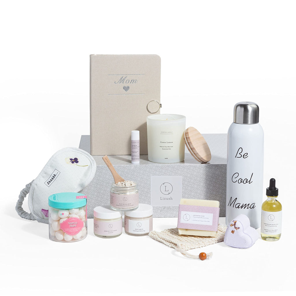 - COMPONENTS: This All Natural Mom Gift Set includes: ❀ Nipple balm ❀ Belly oil ❀ Water Bottle - Be Cool Mama ❀ Big Scented Candle - 8 oz ❀ Journal – Mom (heart symbol) ❀ Lavender Natural Soap ❀ Lavender foot salt ❀ Candy Sparkle ❀ Heart Shower Steamer ❀ Facial Clay Mask ❀ Lip Balm – unscented ❀ Eye Mask – Cotton ❀ Soap Saver - Natural luffa ❀ Door hangtag ❀ Gorgeous box (15x12x5 inches). ❀ Beautiful greeting card