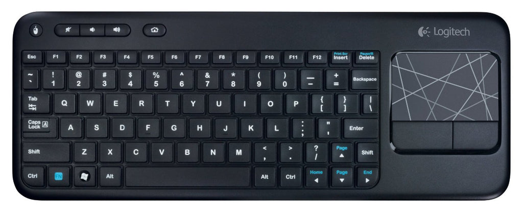 ** Keyboard battery life calculation based on an estimated two million keystrokes/year in an office environment. User experience may vary. Enlarge Long-range wireless control Reliable Logitech Advanced 2.4 GHz wireless connection with up to 33 ft range* Control your TV-connected laptop from across the room Turn up the volume, pause or tweet about the movie you just downloaded—all without leaving the couch Enlarge Comfortable, quiet typing Whisper-quiet low-profile keys Easy-to-read bold, bright-white characters Media hot keys like mute, play, volume up or down for easy entertainment control Sleek, compact design feels just right on your lap Keyboard can be stored vertically to save space Enlarge Built-in large touchpad with intuitive Windows 8 gesture support No need for a separate mouse Large 3.5-inch touchpad with multi-touch navigation for easy horizontal and vertical scrolling Convenient left and right click buttons