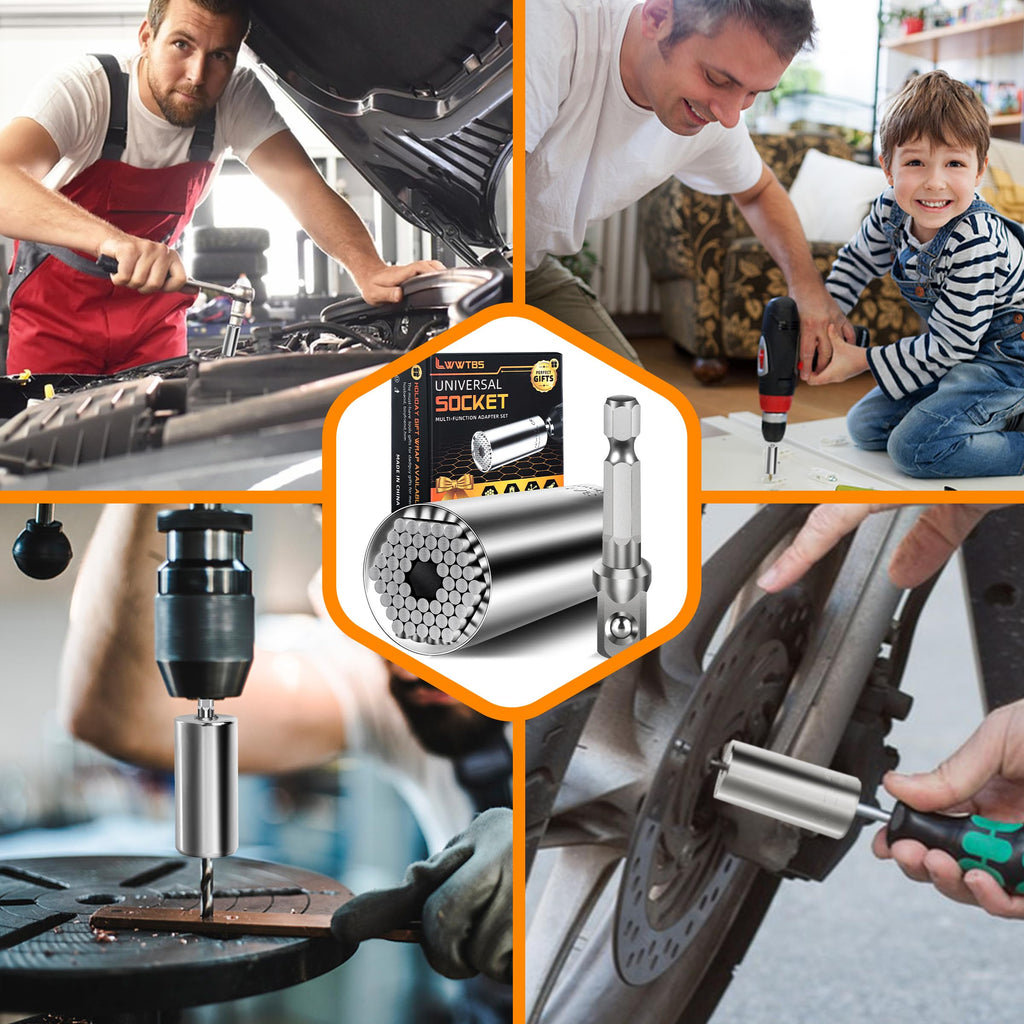 - Awesome Tool Gifts for Men Dad: Men won't know they need universal socket sets until they have one! Universal socket tool attached a drill adapter matches with not only manual ratchet sets but also power drills & multi-bit screwdrivers. Cool gadget for men it is perfect for home improvement, construction, carpentry, auto repair, and other household maintenance. Great addition to toolbox for men and family. Super Universal Socket Set Christmas stocking stuffers for men women.