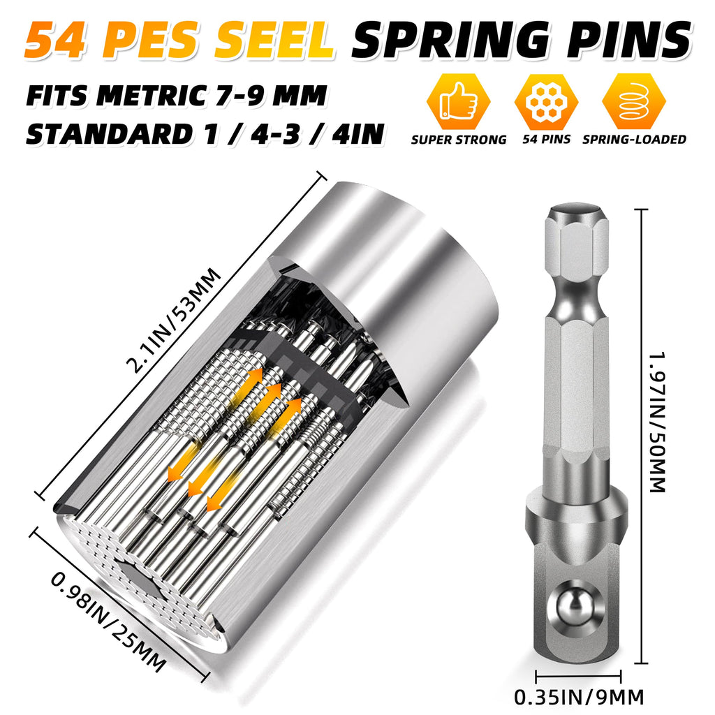- One Size Fits Most Super Universal Socket: Universal socket tools can meet all your needs and improve work efficiency. This super universal socket tool is ranging from standard 1/4" to 3/4" (7-19mm). Meanwhile, features 54 chrome vanadium steel which is tough enough to get jobs done, adjust into various shapes & sizes to grip different nuts, like wing/hook/hex/square nuts, crew eyes, even damaged heads or rusted parts. You won't need to purchase a bunch of separate tools when working with different types of fasteners. Magic universal socket grip!