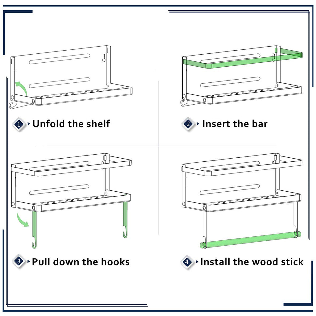 - 2-IN-1 DESIGN: Not noly a spice rack, but also a paper towel holder. This simple wooden paper towel holder is multi- purpose under the shelf which use for kitchen roll paper. It fits average sized paper towel rolls (Less than 11.5 inches long). Double rolls will be harder to move at first until enough sheets are used and the roll gets smaller.