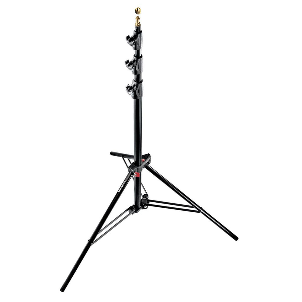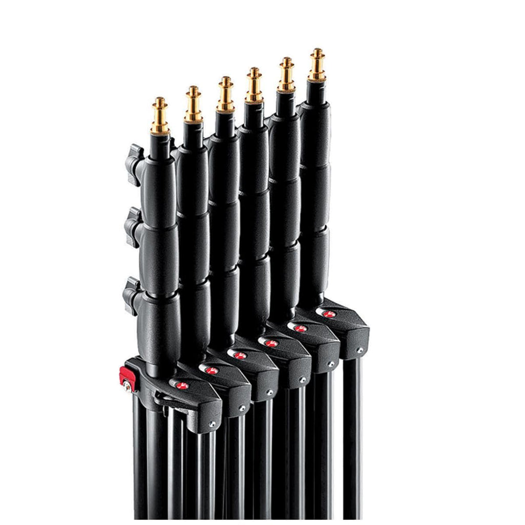 Details: This is a set of three 1004BAC Quick Stack Stands. The 1004BAC 5/8-Inch "Baby" Male Spigot Lightweight stands are another product innovation from Manfrotto Lighting Support. Their lightweight and compact-size make them a practical tool for your lighting support needs. The lightweight stand range consists of 7,8,9 and 12-Feet stands which can be purchased as singles or in 3 packs. With a patented Quick Stack System (QSS) portability is the key feature! Connecting the stands together saves a lot of room while storing them in the studio. A more compact case can be used when shooting outdoors, because of this unique design. 4 section, 3-riser aluminum, air cushioned stand.