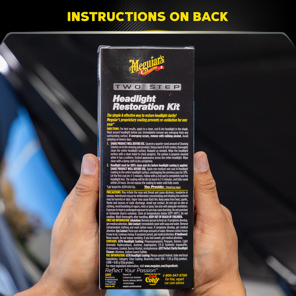 Details: Meguiar's Two Step Car Headlight Restoration Kit is the ultimate solution for restoring your headlights to their former glory. Don't let oxidized, cloudy, or yellowed headlights hinder your visibility and the overall appearance of your vehicle. With our easy-to-use two-step process, you can achieve professional-grade results quickly and effortlessly.Step 1: Start by cleaning the surface of your headlights using the included cleaning solution and abrasive cleaning pad. This powerful combination effectively removes built-up oxidation, grime, and other contaminants, ensuring a clean and smooth surface for the restoration process. Simply apply the cleaning solution, gently scrub the surface with the abrasive pad, and then wipe it off with a soft microfiber cloth.Step 2: Once the surface is clean and dry, it's time to apply the headlight coating. Our specially formulated coating is designed to restore the plastic to a crystal-clear finish, effectively eliminating any signs of oxidation, cloudiness, or yellowing. The coating not only enhances the clarity and brilliance of your headlights but also provides long-lasting protection against re-oxidation. With just a few sprays, ensure that the entire surface is evenly and thoroughly coated for optimal results.By following this straightforward two-step process, you can achieve remarkable headlight clarity that lasts for up to a year. Say goodbye to diminished visibility and unsightly headlights; instead, enjoy the improved safety and aesthetics of your vehicle.Meguiar's is a trusted name in car care, known for producing high-quality products that deliver outstanding results. Our Headlight Restoration Kit is no exception, offering a simple yet effective solution to remove oxidation, cloudiness, and yellowing. Don't let dull headlights compromise your driving experience - restore them with Meguiar's Two Step Car Headlight Restoration Kit and experience the brilliance that your vehicle deserves.