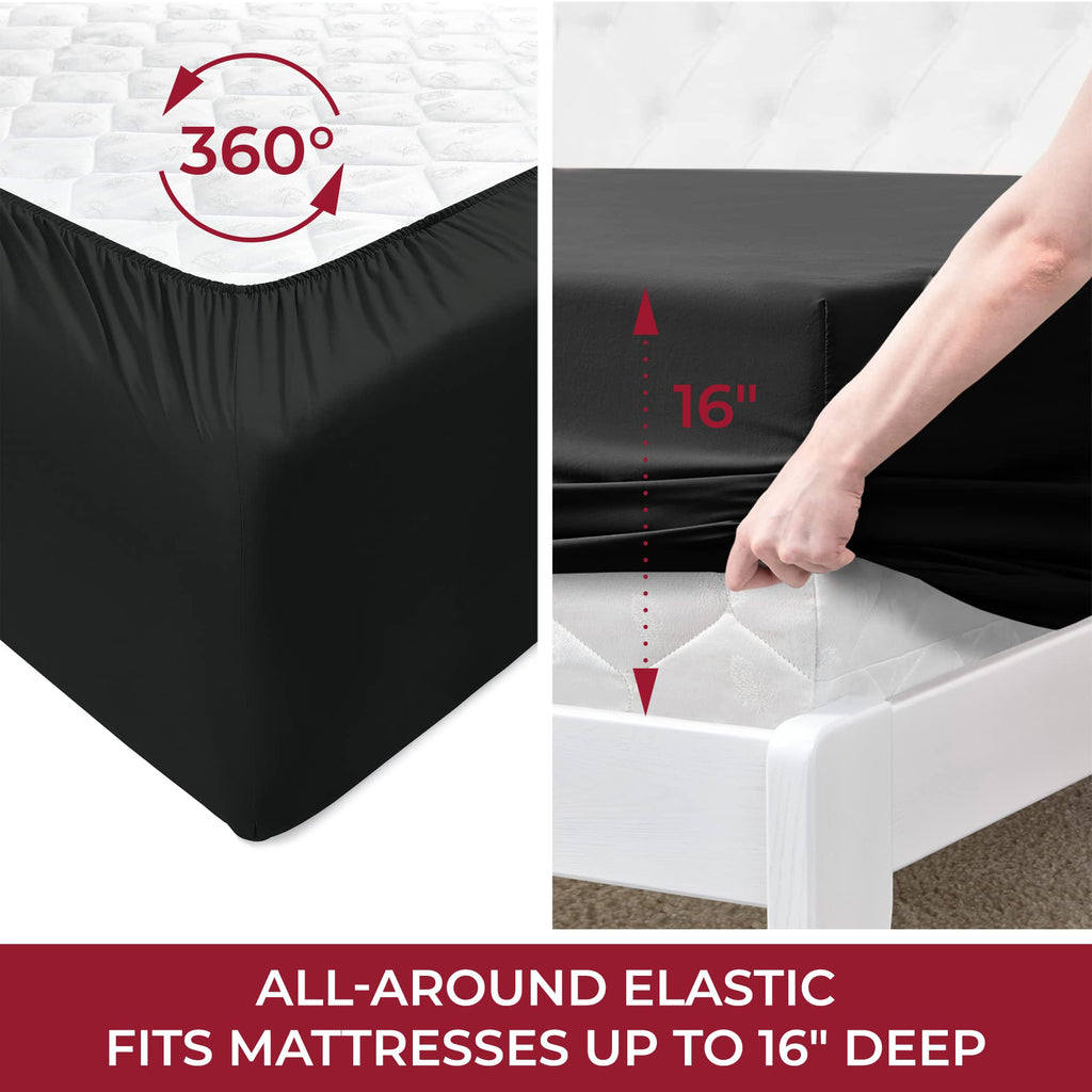 - Queen Size Double Brushed Microfiber 4pc Bed Sheets Set - 1 flat sheet 102"x90", 1 fitted sheet 80"x60", 2 pillowcases 20"x30". Deep pocket fitted sheet with elastic all around (not just the corners, like other sheets). Fits mattresses up to 16"