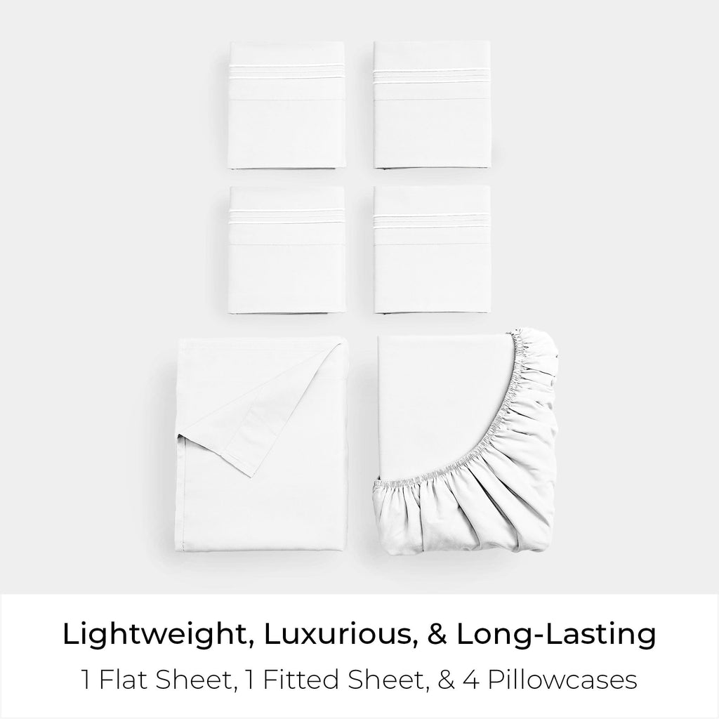 - Complete 6-Piece King Bedding Set - Includes 1 Fitted Sheet (78"x80"x16"), 1 Flat Sheet (102"x105"), & 4 Pillowcases (20"x40") - all crafted from double-brushed microfiber for an ultra-soft feel. Temperature-regulating to keep you cozy in winter and cool in summer.