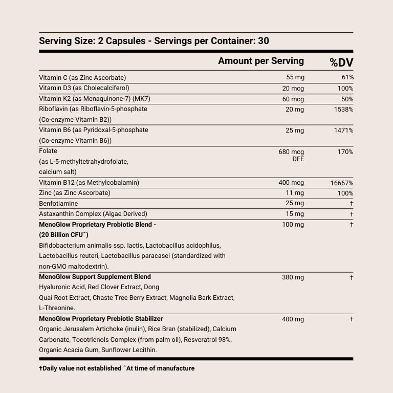 Details: p>ABOUT US: MenoLabs was built by women for women. Our products are built for your symptoms through all stages of menopause, and with the best science we can find to back them. Our probiotic supplements for menopause include the highest quality of ingredients proven to work and address the specific needs of women in menopause. BEAUTIFUL INSIDE AND OUT: MenoGlow is the best probiotic for women who want to help the symptoms of menopause while achieving healthier and younger looking skin. The hormone changes can affect your microbiome, which in turn can affect your body's ability to produce what it needs to maintain the elasticity of your skin and the strength of your hair and nails. GET YOUR GLOW BACK: Our doctor-formulated blends are backed with over 20 years of research to help women with their menopause symptoms and provide a way to fight signs of aging, including fine lines, wrinkles, acne, and brittle hair and nails. OUR PATENTED PROBIOTIC BLEND: B420 - Weight Loss and Hormone Balance* Lactobacillus reuteri - Anxiety, Digestion, and Immune Support* Lactobacillus paracasei - Skin Health* Lactobacillus plantarum - Weight Loss, Metabolism, and Immune Support*