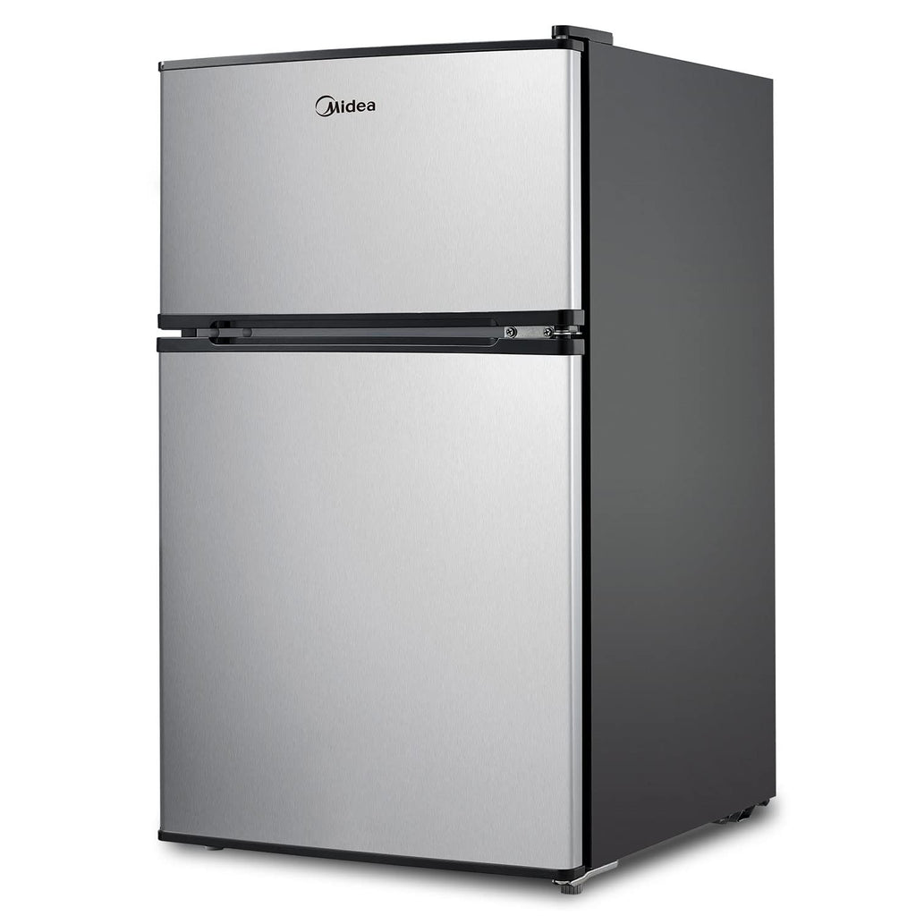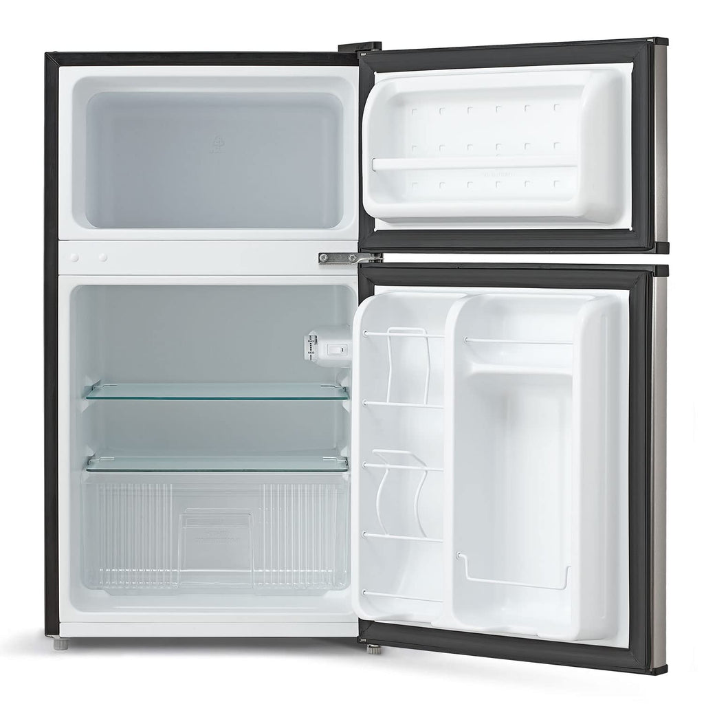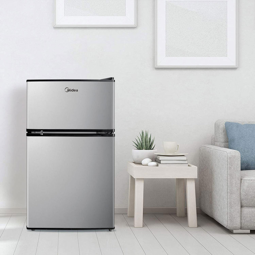 Designed to operate with Energy Star efficiency, the Midea 3.1 Cu. Ft. Double Door Compact Refrigerator offers separate fridge and freezer sections with plenty of space for produce, snacks, and frozen treats. Thanks to its adjustable legs and reversible door that opens to the left or right, you can easily fit this compact fridge in any kitchen layout. Organization is made even easier with durable glass shelves, a roomy crisper drawer, and storage racks for soda cans. The mechanical temperature control lets you easily set chilling preferences, while the manual defrost setting enables hassle-free cleaning.