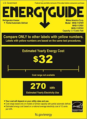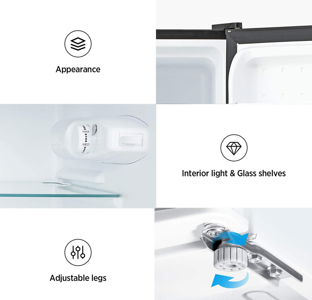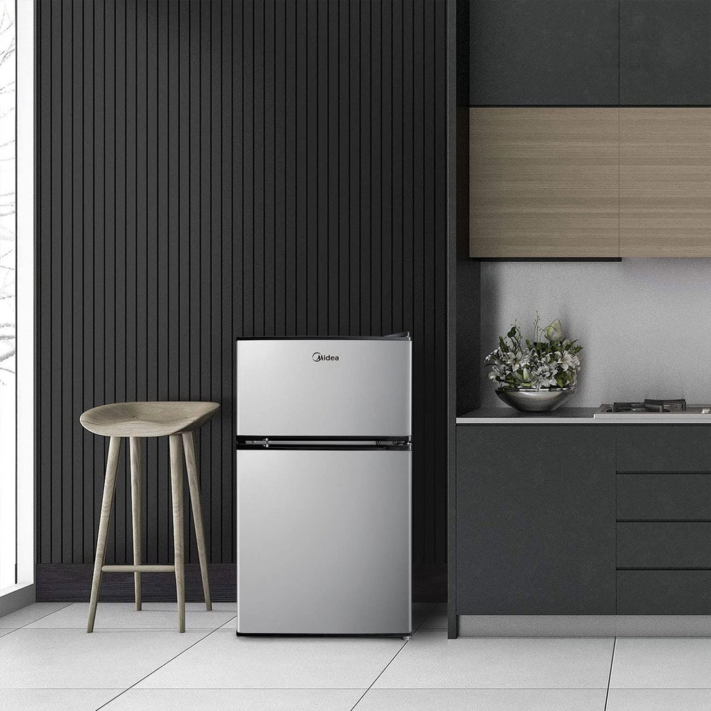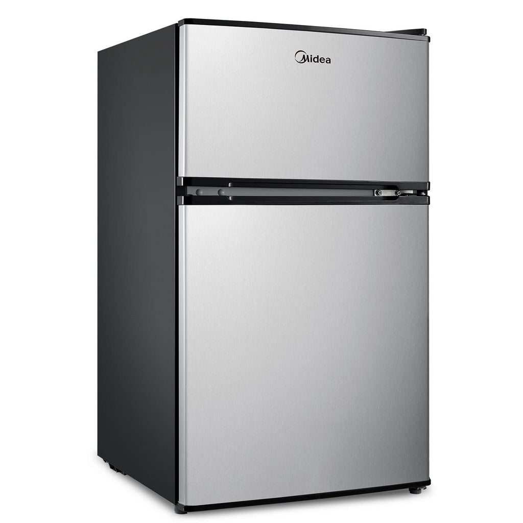 Designed to operate with Energy Star efficiency, the Midea 3.1 Cu. Ft. Double Door Compact Refrigerator offers separate fridge and freezer sections with plenty of space for produce, snacks, and frozen treats. Thanks to its adjustable legs and reversible door that opens to the left or right, you can easily fit this compact fridge in any kitchen layout. Organization is made even easier with durable glass shelves, a roomy crisper drawer, and storage racks for soda cans. The mechanical temperature control lets you easily set chilling preferences, while the manual defrost setting enables hassle-free cleaning.