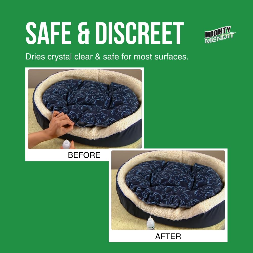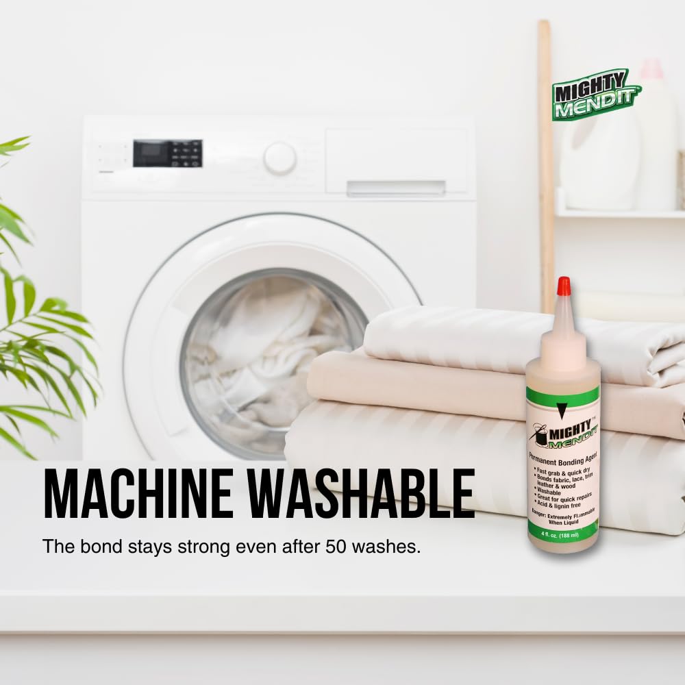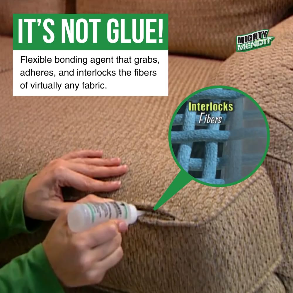 • SUPER STRONG ADHESIVE MIGHTY MENDIT bonding agent grabs and adheres to virtually any fabric including denim, leather, and corduroy. Permanent adhesive interlocks the fibers in a fabric to repair tears in clothing, furniture upholstery, and other mending needs.