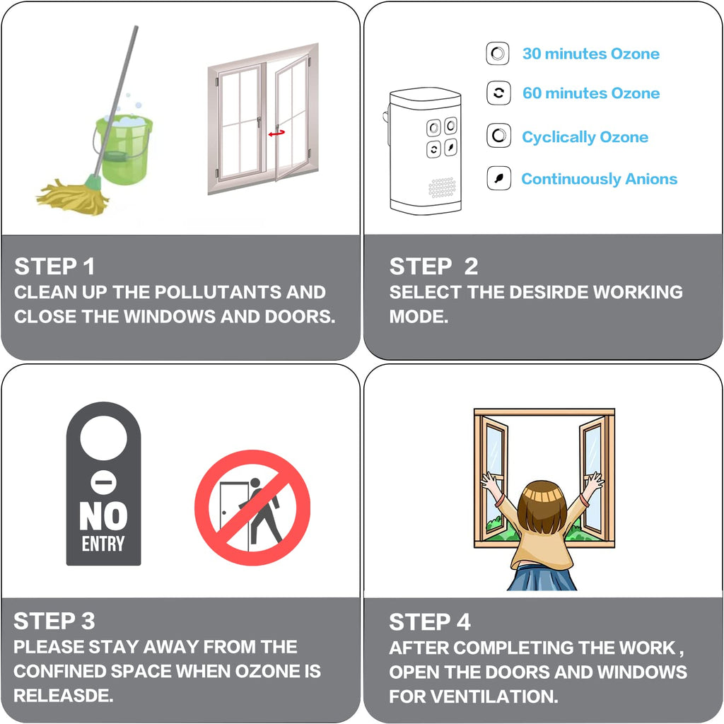 - 【Multiple working modes】You can easily select four working modes by pressing the button directly Including ozone short time operation, cyclic operation, continuous negative ion release, etc.