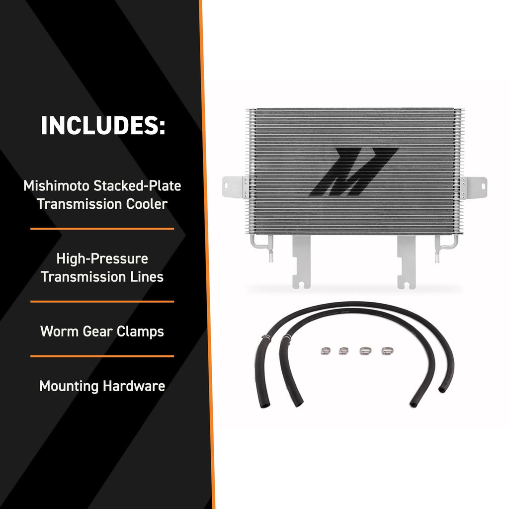Details: Heavy loads are no match for a 1999-2003 7.3L Powerstroke equipped with the Mishimoto 7.3L Transmission Cooler. The stock 7.3L Powerstrock transmission cooler can come up short of providing sufficient cooling, and with more weight in the truck bed, transmission temperatures tend to rise. Avoid those high temperatures and complement your cooling system with the latest addition to Mishimoto's 7.3L Powerstroke performance parts, the all-new 7.3L transmission cooler. With the Mishimoto 7.3L Transmission Cooler, high transmission fluid temperatures will be the least of your worries. The 37-row Mishimoto stacked plate cooler provides a larger surface area over both of the stock coolers. Core volume is increased by a whopping 265%, and fluid capacity is increased by 1.0 qt. The increased size of this 7.3L transmission cooler provides a proven 10+ DegreeF drop in transmission fluid temperature. No modifications are necessary for installation, and, just like all Mishimoto 7.3L powerstroke parts, this cooler comes with the Mishimoto lifetime warranty.