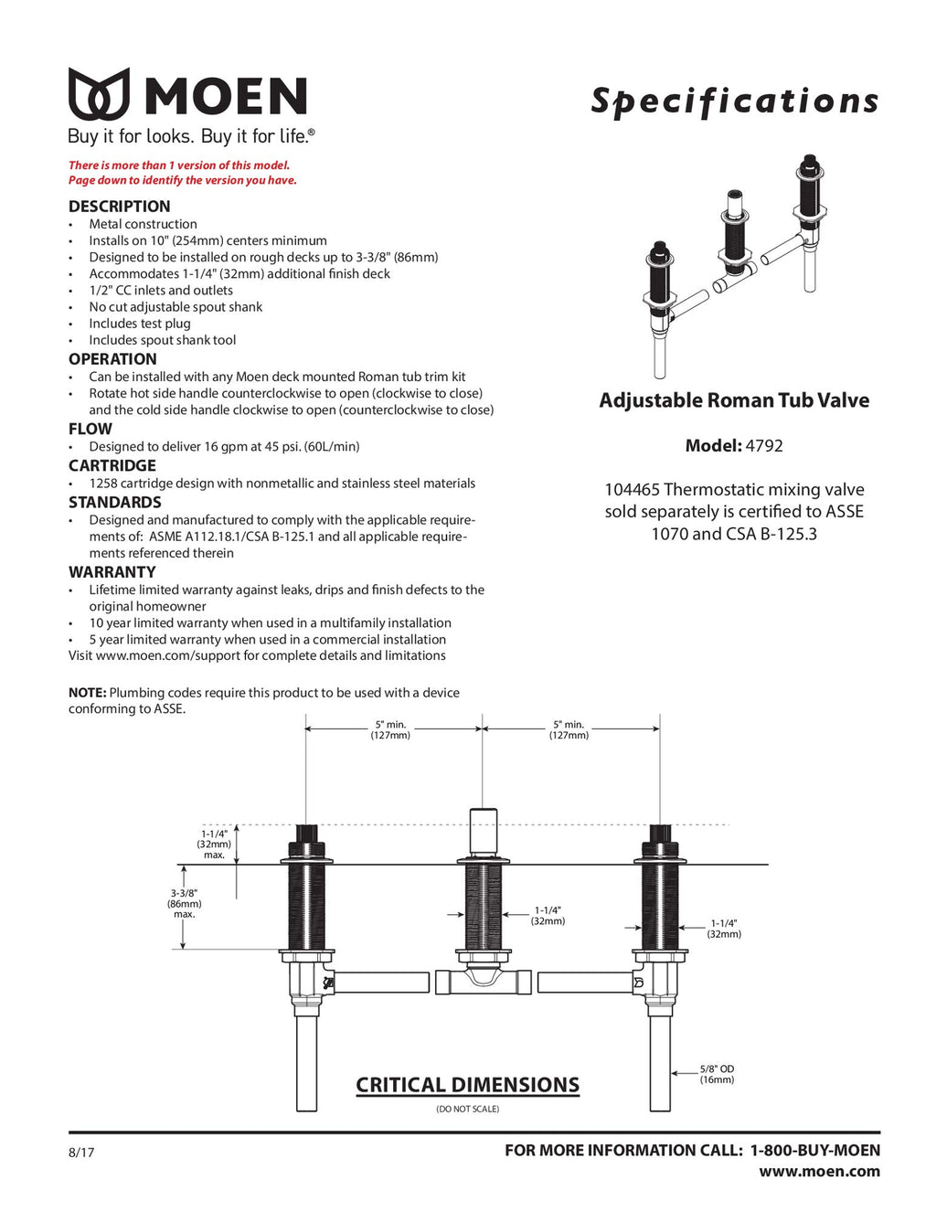 Easily change the style of your Roman tub faucet with the Moen Two-Handle Roman Tub Valve. Designed with Moen M-PACT technology, the valve is compatible with all Moen Roman tub trim kits that have been built on the M-PACT valve system. Once installed, the valve allows you to easily update your trim kit without changing any of the plumbing. Featuring high-quality construction and backed by Moen's Limited Lifetime Warranty, the Moen Two-Handle Roman Tub Valve adds durability and convenience to your plumbing system. From the Manufacturer Two handle roman tub valve adjustable 1/2-Inch CC connection.