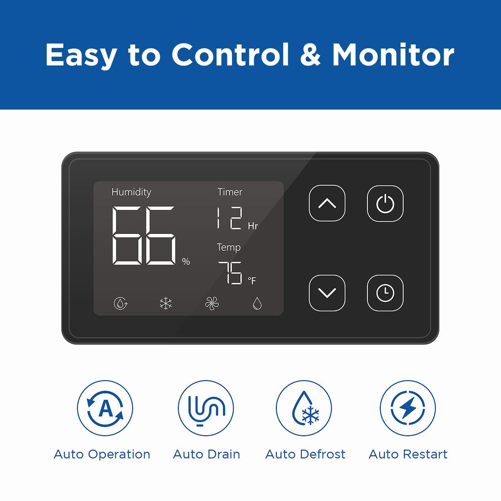 - Smooth Humidity Control with Customized Panel: Streamlined operation is at your fingertips. Simply set your preferred humidity level on the customized control panel, and this crawl space dehumidifier takes care of the rest. With automatic cycling ON/OFF, it maintains your desired humidity level seamlessly. The convenience extends further with automatic drainage, defrosting, and restarting after a power outage, ensuring a truly hands-free experience in humidity management.