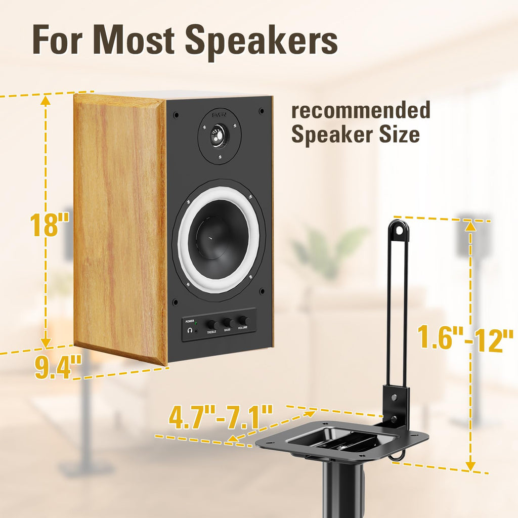 - EASY ASSEMBLY - Our speaker stands can be assembled in minutes. With adjustable speaker bracket, these floor speaker stands can work on speakers of MAX size 9.4"(D) x 18"(H) and with mounting holes up to 12 inches height
