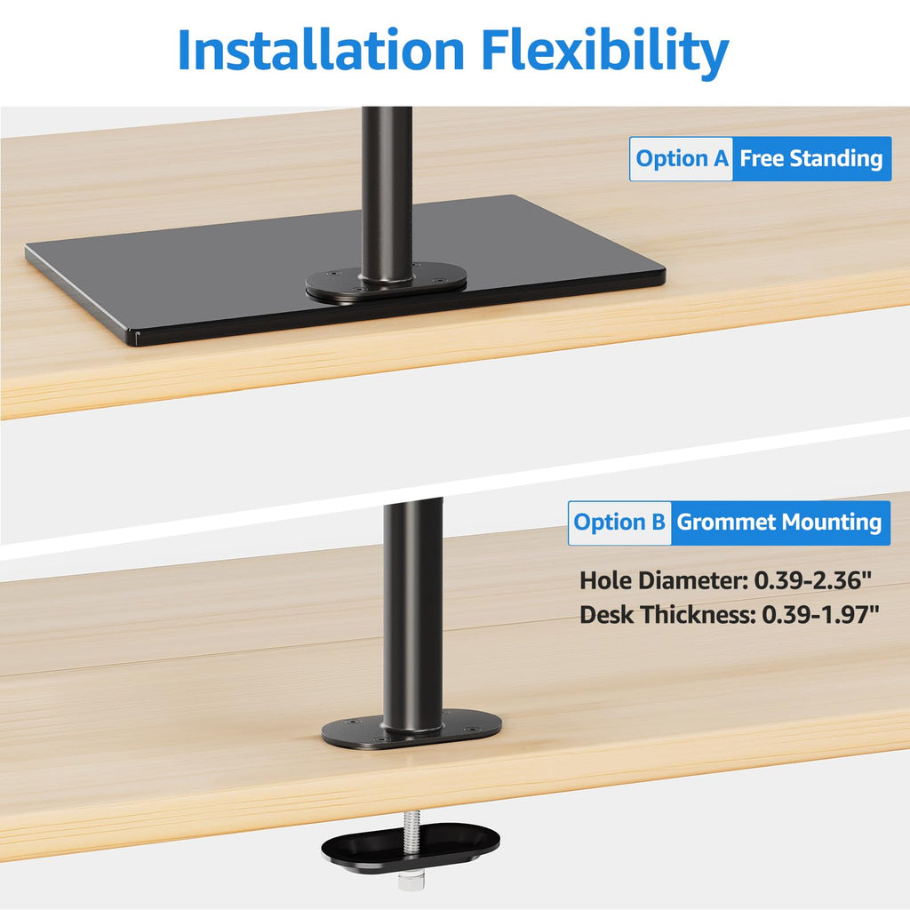 - Worry-free Assembly: Quick and easy installation within 15 minutes with no hassle, accompanied by clear instructions. Besides the freestanding option, the monitor desk mount includes an installation option. The grommet mounting fits the desktop 0.39" - 3.15" thick with a bolt-through hole 0.39" - 2.36".