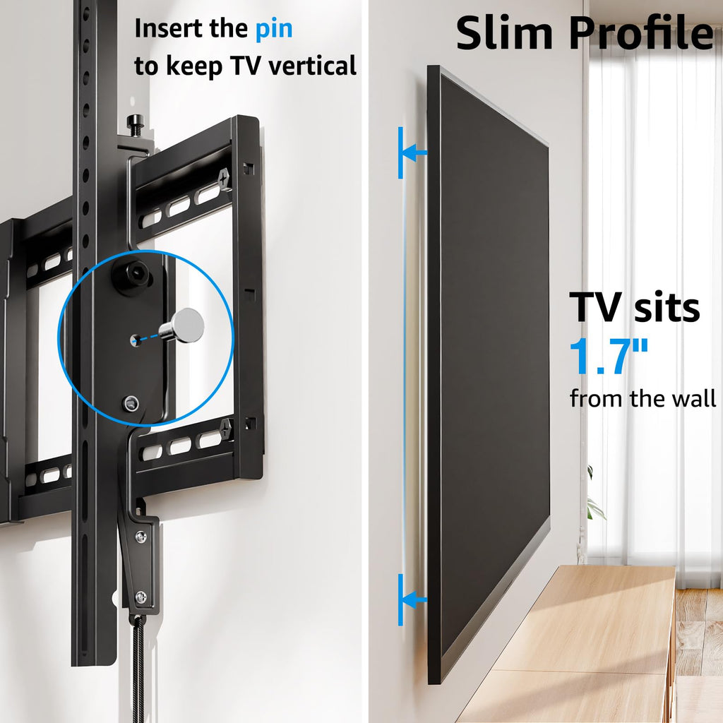 - Safe & Convenient: This low profile tilting TV wall mount has an open wall plate design allowing it to be mounted directly over electrical outlets for a super clean installation. Breezily locks and releases your TV with pulling cords and the elegant panel edges prevent your TV from slipping off