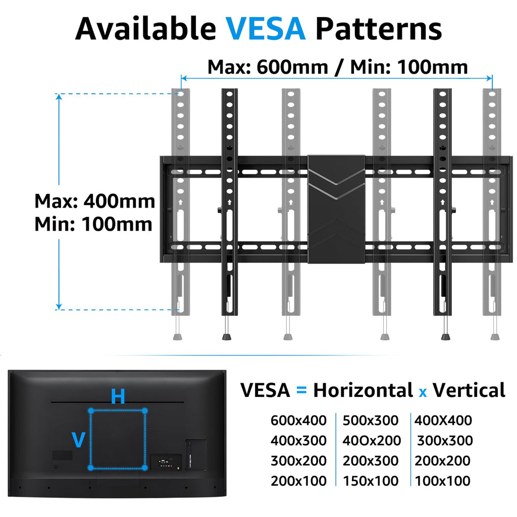 - Universal TV Wall Mount: The tilting TV wall mount is compatible with most 37-75 inches flat screen or curved TVs up to 99 lbs. Fits VESA 100x100 mm to 600x400 mm mounting patterns. Design for wood studs spacing up to 24 inches. NOTE: Please check the VESA, TV weight, wood studs spacing, and possible blocked cable/input for a better experience