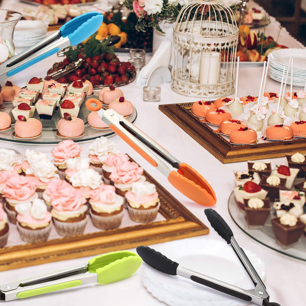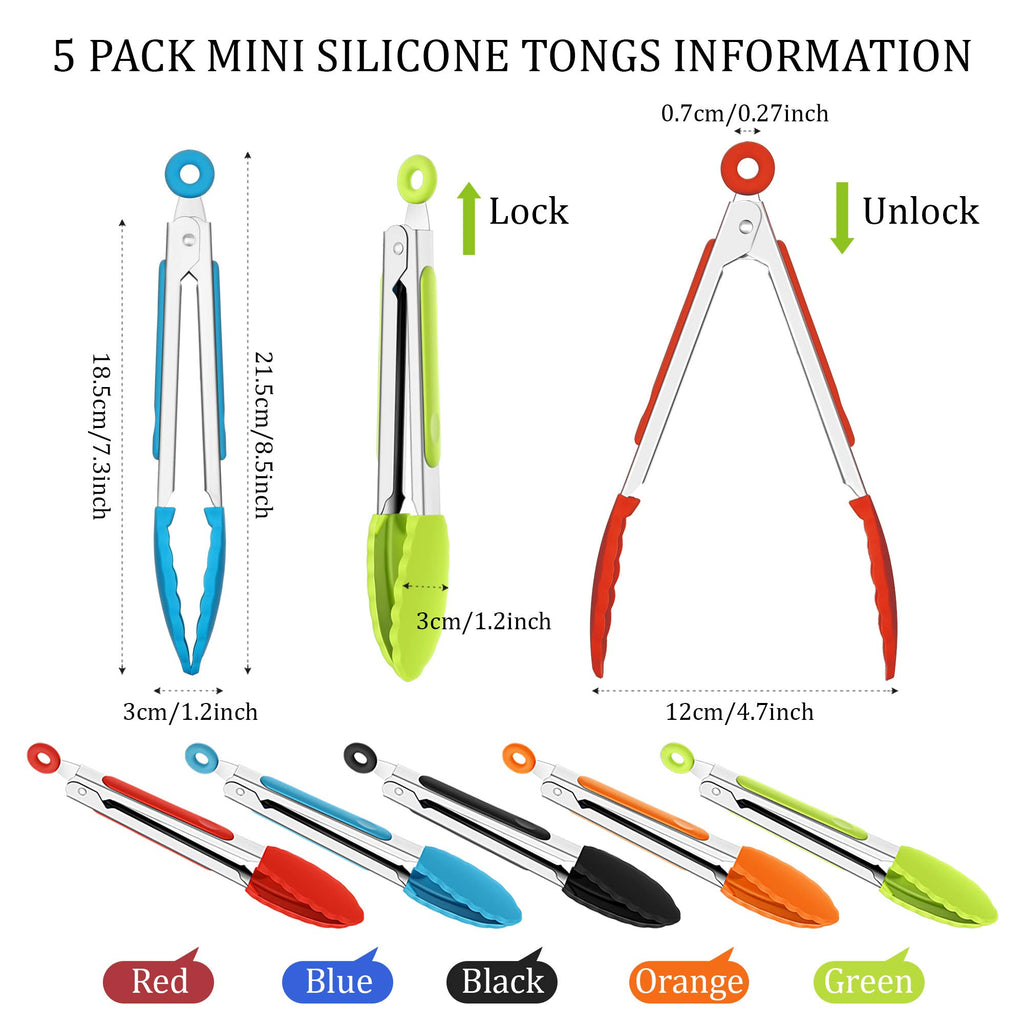 - Multicolor tongs: you will receive 5 pieces small cooking tongs, and each pair of tong comes with colorful silicone grips, 5 vibrant colors are available, red, black, green, blue, orange, which will add some color and fun to your party and dinner table