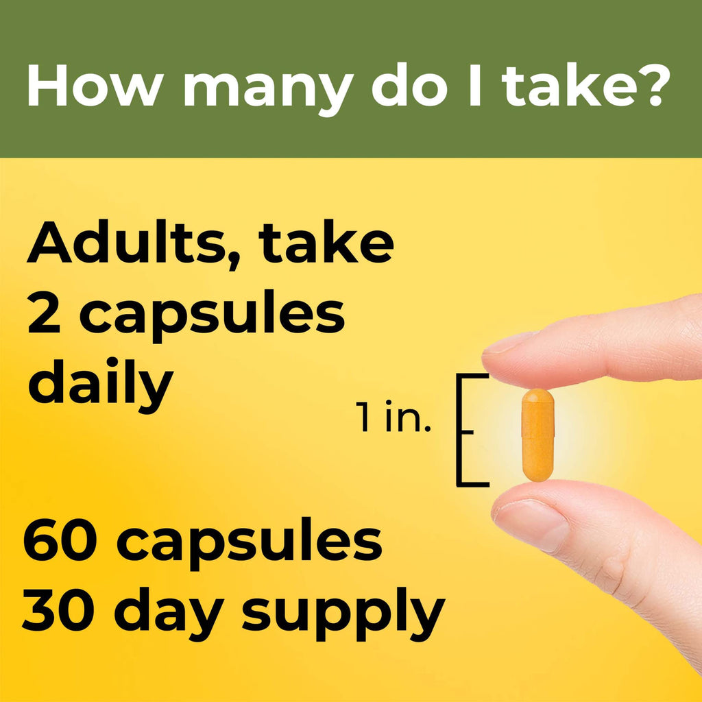 - Adults, take two vegetarian Turmeric Curcumin with black pepper capsules daily with water and a meal