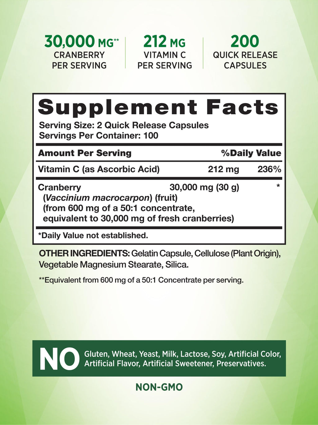 These quick release Cranberry with Vitamin C capsules are made to help you enjoy the support of Cranberry right away. This triple strength formula provides a concentrated source of cranberry from a 50:1 concentrate of Vaccinium macrocarpon fruit - the equivalent of 30,000 mg of fresh cranberries per serving. A perfect alternative to sugary cranberry juice, this concentrated formula is enhanced with 212 mg of Vitamin C for additional support.