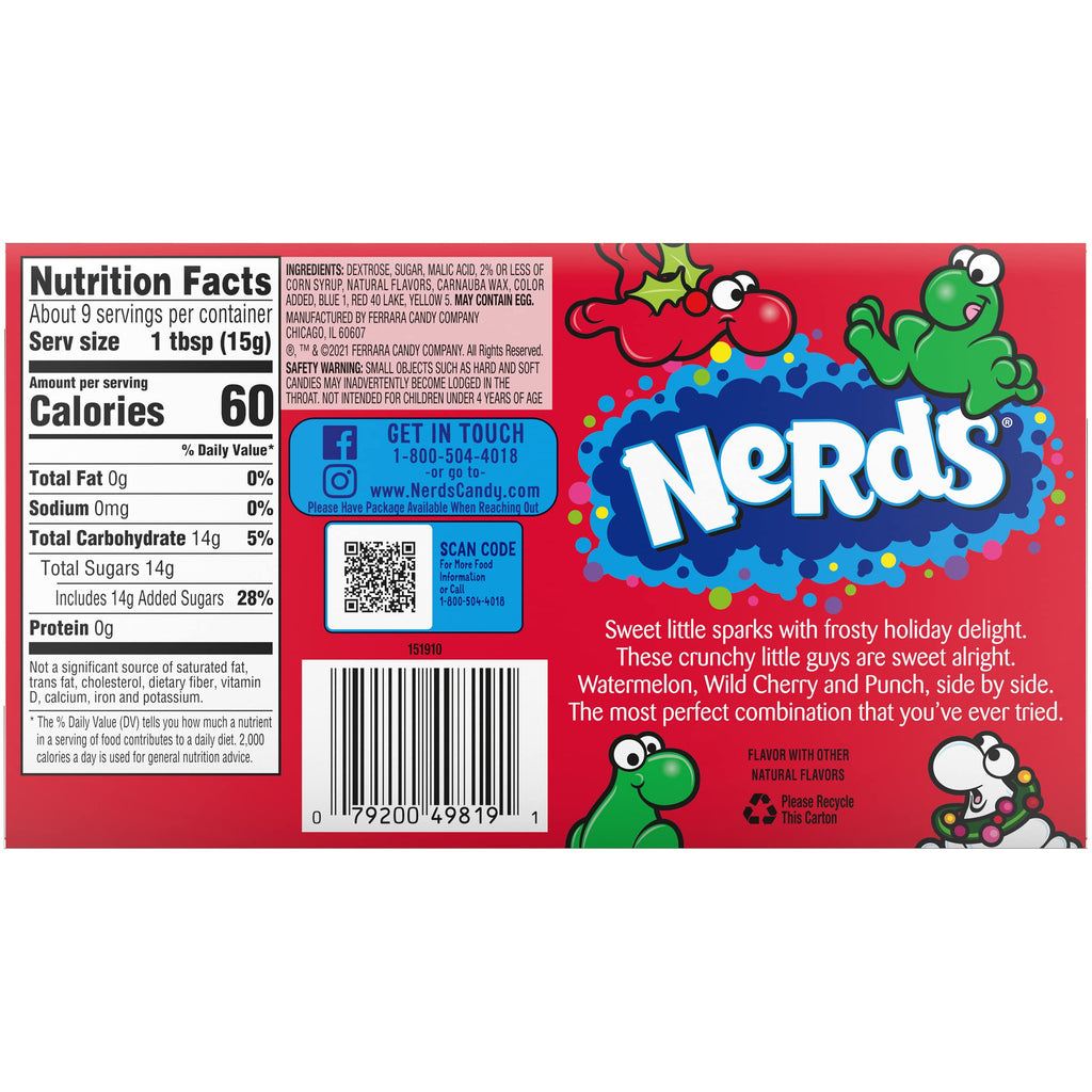 - Holiday Candy Fun for All: Enjoy the delightful mix of watermelon, cherry, and punch flavors with Nerds Frosty theater boxes. This pack of 12 is perfect for sharing the holiday joy with family, friends, and classmates.