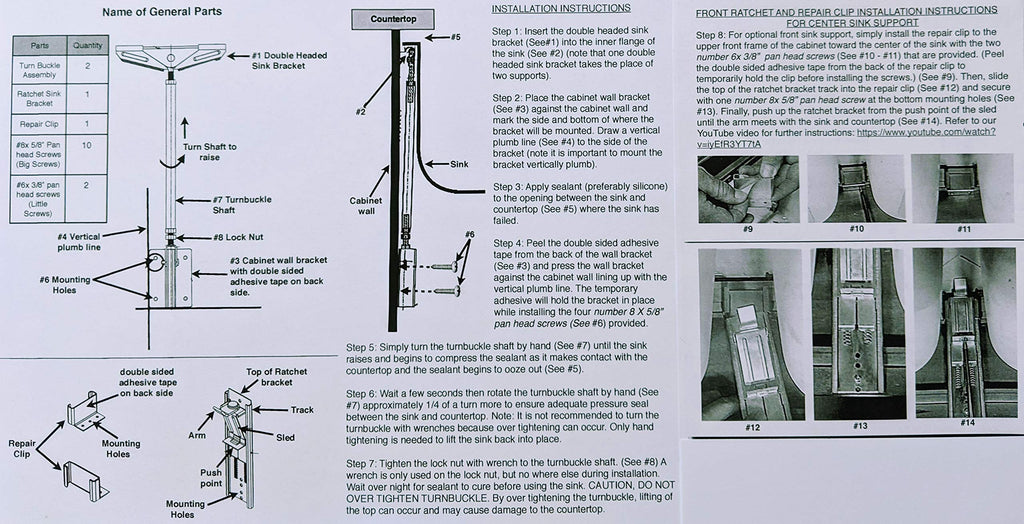 - Please note- only 1 kit is necessary for the average fallen sink because each turnbuckle has a double headed sink bracket at the top that pivots to provide 2 points of contact for the front as well as the rear portions of the sink. Each turnbuckle takes the place of 2 supports. Therefore, 2 turnbuckles equals 4 supports plus the front center ratchet totaling 5 points of reinforcement.