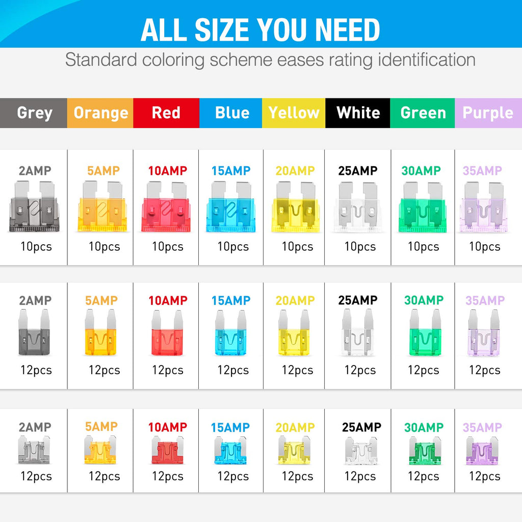 - ALL SIZES YOU NEED: Covers 8 commonly used blade fuses, 272 PCs, mini: 2A 5A 10A 15A 20A 25A 30A 35A Blade Fuses, commonly used in most auto cars, trucks, SUVS, boats etc.