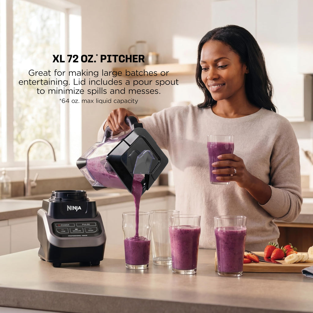 The Ninja professional blender 1000 features a sleek design and outstanding performance with 1000 watts of professional power. Ninja total crushing blades gives you perfect ice crushing, blending, pureeing, and controlled processing. The XL 72 oz. Professional blender jar is great for making drinks and smoothies for the whole family.