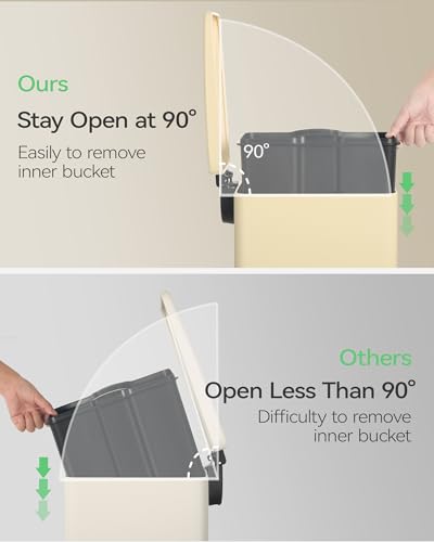- EASY TO USE AND MAINTAIN: The removable inner bucket makes cleaning a breeze. Simply lift it out and empty the trash without any hassle. Plus, the foot pedal mechanism allows for hands-free opening, The lid can also be manually opened to 90°and kept in that position.