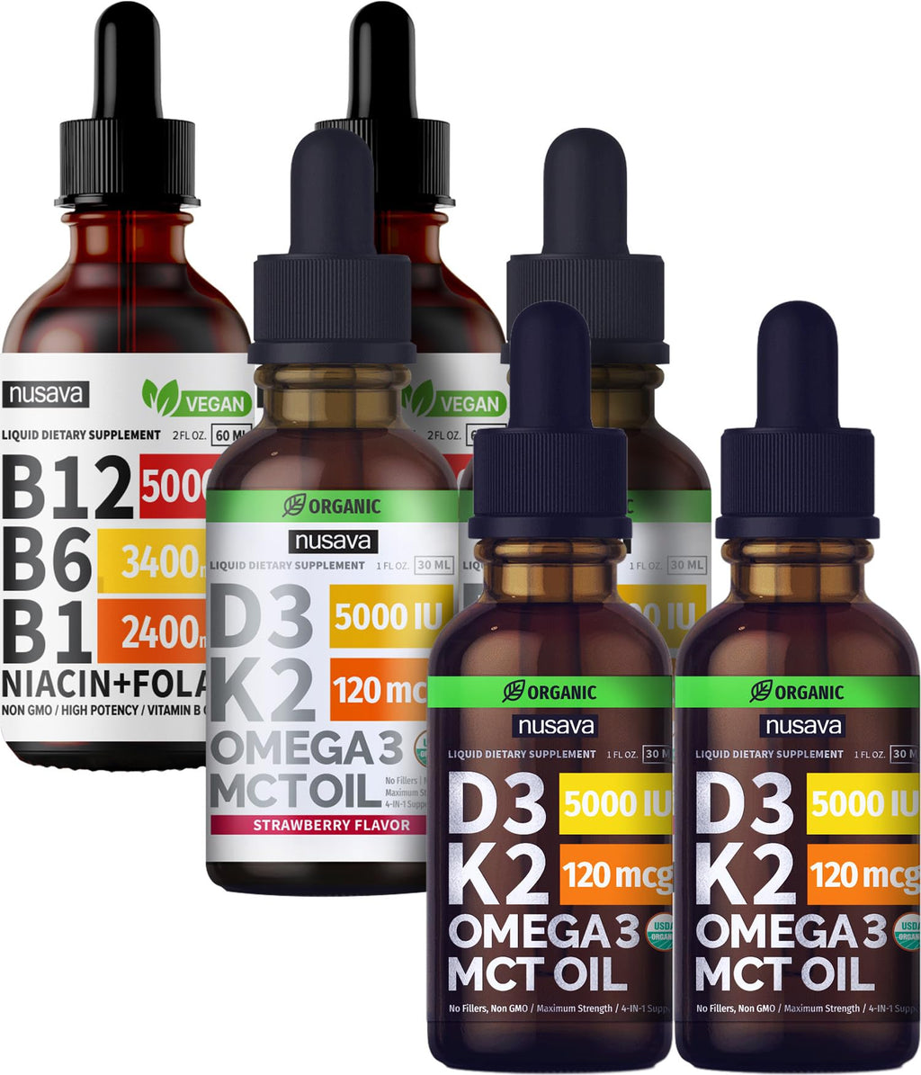 Details: Get your daily dose of essential multivitamins with Nusava’s holistic supplement trio: Unflavored D3 K2 Liquid Drops, Strawberry Flavored D3 K2 Liquid Drops, and Vitamin B12 Liquid Drops. The Nusava Vitamin D3, Vitamin K2, Omega-3, and MCT Oil supplement is designed to be a convenient all-in-one liquid vitamin D. It's a 4-in-1 maximum strength supplement that comes in a 1 fl. oz/30 ml dropper bottle, providing 30 servings per bottle—equivalent to 2 months' worth of potent Vitamin D K2 support. The Nusava D3 K2 Vitamins aim to assist your body with comprehensive support ranging from bone growth, muscle development, and energy metabolism to immunity, joint integrity, and heart. Meanwhile, Nusava B12 Drops take it up a notch with its potent 5-in-1 B Vitamin formula, providing comprehensive benefits. Each serving contains a blend of essential B vitamins, including a high dose of Vitamin B12 (as Methylcobalamin), Vitamin B6 (as Pyridoxine Hydrochloride), Vitamin B1 (as Thiamine Mononitrate), Vitamin B3 (Niacin), and Vitamin B9 (Folate). This meticulously crafted blend ensures you receive the full spectrum of B vitamins, each working synergistically to optimize various bodily functions. Elevate your well-being today with this exceptional bundle of (2) bottles of Organic Unflavored Vitamin D3 K2 Liquid Drops, (2) bottles of Strawberry Flavored Vitamin D3 K2 Liquid Drops, and (2) bottles of Vitamin B12 Liquid Drops.