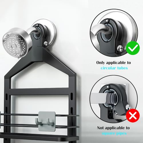 - Anti-Swing Installation: A rubberized shower head grippe supports the shower shelf from above, and adhesive sticker fits snugly over the shower caddy to secure it into place from below. So it won’t get knocked off balance when you take bottles in and out of over the shelf.