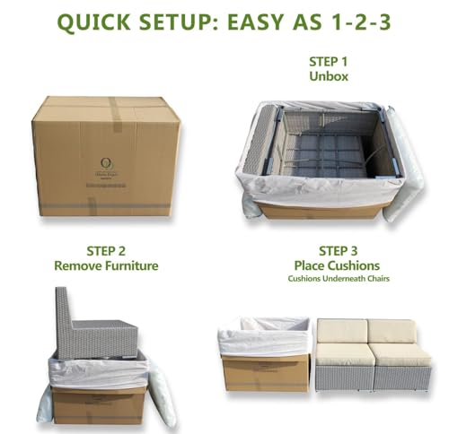 Details: Create a beautiful outdoor area you've always dreamed of with patio furniture by Ohana Collection. Constructed with top quality all-weather PE resin wicker hand-woven around rust-free powder coated aluminum frame, it is designed to withstand the elements. Each set features unique sloped cushions and tall back for extra comfort. Weather resistant cushion covers are available in vibrant colors and zippered for easy cleaning. Hidden velcro strips hold cushions together. Stainless steel accents highlight modern design. Free protective cover is included with a set of seat clips to hold chairs together. Modular set can be used as shown or configure to suit your patio. NO ASSEMBLY required - solid welded frames provide structural integrity and aesthetically pleasing seamless finish. Curbside delivery with signature required. Enjoy right out of the box!