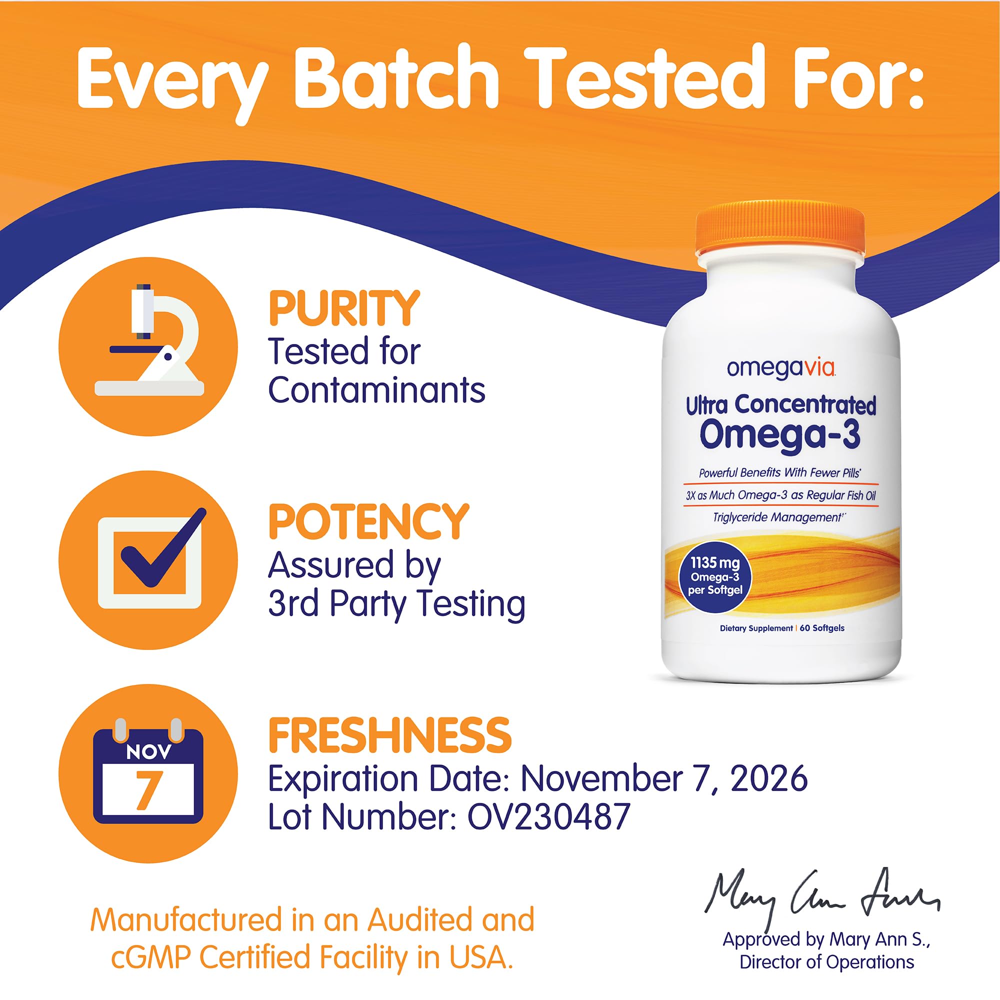 - Quality Tested OmegaVia Ultra Concentrated Omega 3 Fish Oil supplements are 3rd party tested twice, both the raw ingredients and the finished omega 3 supplement are tested